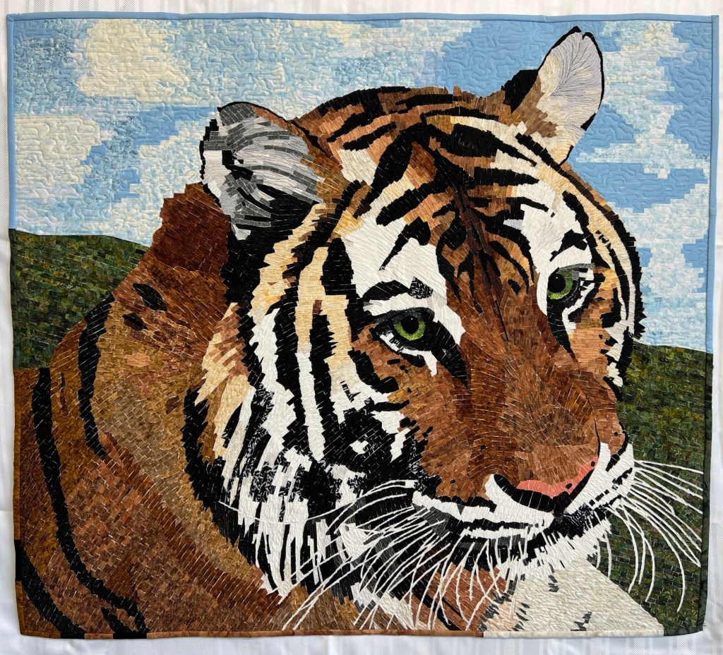 The magnificent Amur tiger is the largest big cat species in the world. They are also the world’s most endangered. It is estimated that less than 4,000 are left in the wild. I had the privilege of volunteering at the Edmonton Valley Zoo and Taiga was one of the animals on my shift. This mosaic is made up of over 10,000 tiny 1/4 inch wide pieces of hand cut cotton and thread play.