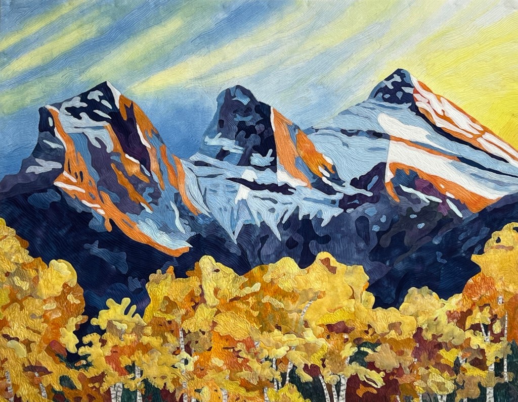 This textile art quilt captures a moment of quiet power and transformation—the sun rising over the iconic peaks of the Three Sisters mountain range in the heart of fall. With fabric as my paint and thread as my brush, I aimed to translate the majesty of this landscape into texture, color, and warmth.