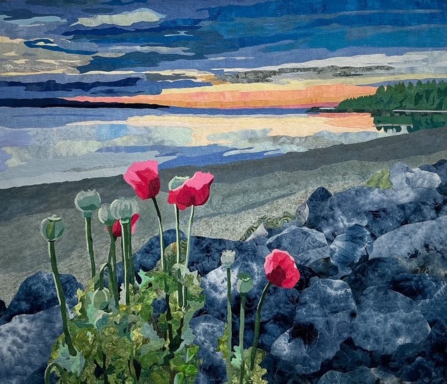 This piece is a tribute to the quiet power and layered beauty of our coast. Inspired by early mornings along the shores of the Salish Sea, it captures a fleeting moment where light, land, and sea converge—when the first rays of sunrise ignite the horizon and the poppies, resilient and vibrant, stand as guardians of the shoreline. Through texture, layering and the language of cloth, this piece is both a celebration of the natural beauty and a meditation on the interconnectedness of ecosystems, light and memory.